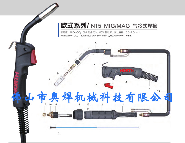 济南诺斯原装QTB-160A/N15小手柄推丝焊枪,欧式接口气冷式推丝二氧化碳焊枪同型号15AK 3米、4米、5米气保焊枪。公司通过ISO9001:2000国际标准质量体系认证,产品通过国家强制CCC认证和欧盟CE认证。